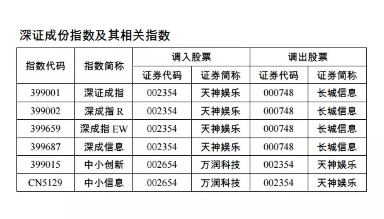 根据深圳证券交易所1月13日发布的《 关于调整深证成指等指数样本股的公告》显示,,,深交所决定于1月18日对深证成指、、、深证300等指数样本股进行调整,,,其中将天神娱乐(002354)调入深证